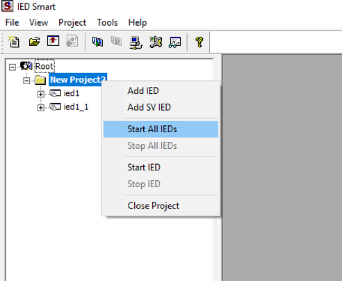 The user can start all the IEDs in a project, right-click on the project name and select “Start All IEDs” to start